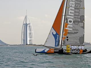 Dubai is well-known for its moderate sailing conditions, but on that Monday the weather forecast was an exception to the rule. The wind would pick up to twenty knots in the afternoon with unusual rain showers. Team Van Oord prepared itself for a rough trip around The World. At 01:18:20 hours pm local time, the four Dutch sailors crossed the starting line at the southeast corner of the archipelago. It was already cloudy and soon the swell built up. The catamaran was flying a hull. After the northern point of The World, the breeze increased and Team Van Oord gained speed. They did twelve to sixteen knots going upwind. They hoisted the kite, but at 02:40 hours pm it went wrong in the very last gibe with a few minutes to go. De Ridder: "I steered too fast, so after the main came over, we immediately went upwind and I could not alter our course anymore. I probably was too eager to break the record." The forty foot catamaran capsized slowly with only Mark van Gelderen on the windward hull. After the mast hit the water, it went down quickly and got stuck in the sea-bed. A squall came over and made it all look unreal. The first attempt to rescue the catamaran failed. The shore crew on the motorboat tried to upright the VX 40, but the pressure on the carbon mast was too much. It broke at about 03:15 hours pm and the crew was rescued by their own people and equipment. I captured the capsize and this sequence was published in Dinghy Sailing Magazine (UK).